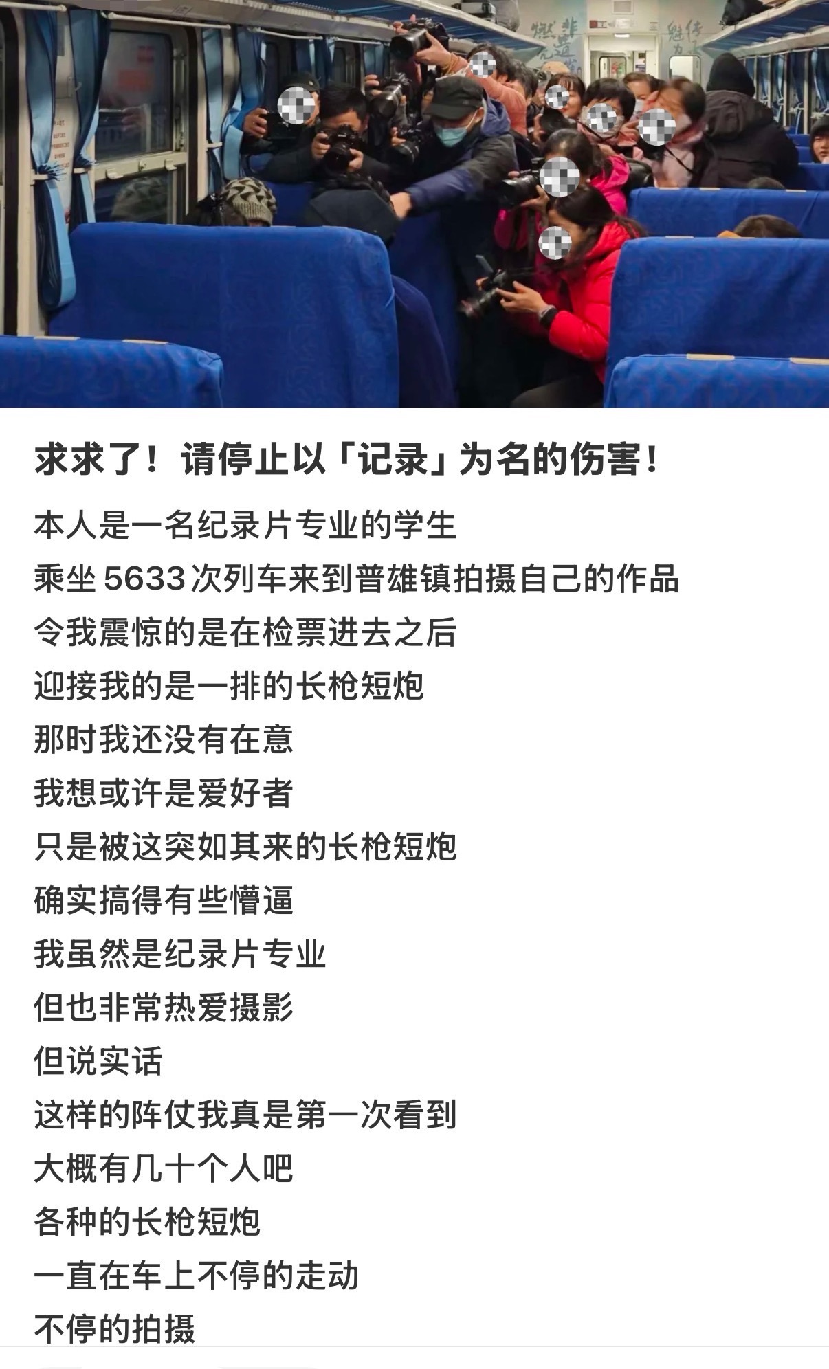 近日,有网友在社交平台发帖,称11月18日她乘坐5633次列车从普雄镇普雄站上车后,看到令人气愤的一幕。一群摄影爱好者拿着各种“长枪短炮”,在车上不停地走动、拍摄,最后围在一名身着彝族服饰的老人面前,举起相机近距离“围攻”,“怼着”老人拍摄。即使老人表现出了不适、不愿意的想法,摄影爱好者们也没有停止按动快门。