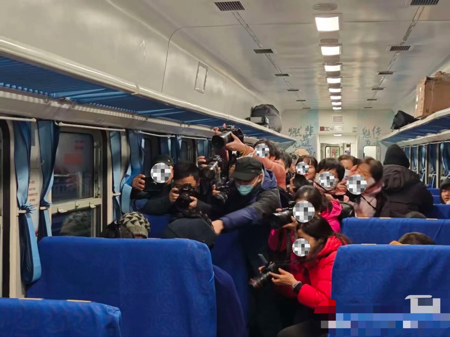 列车上,一群摄影爱好者围着一名老人拍摄